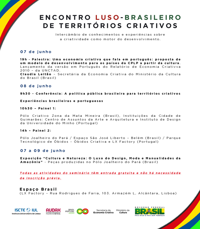 O “Encontro Luso-Brasileiro de Territórios Criativos” integra a programação de encerramento das atividades do “Ano do Brasil em Portugal/Ano de Portugal no Brasil”, que tem como comissários gerais Antônio Grassi, presidente da Funarte (Brasil), e Miguel Horta, presidente da Fundação Luso-Brasileira (Portugal).